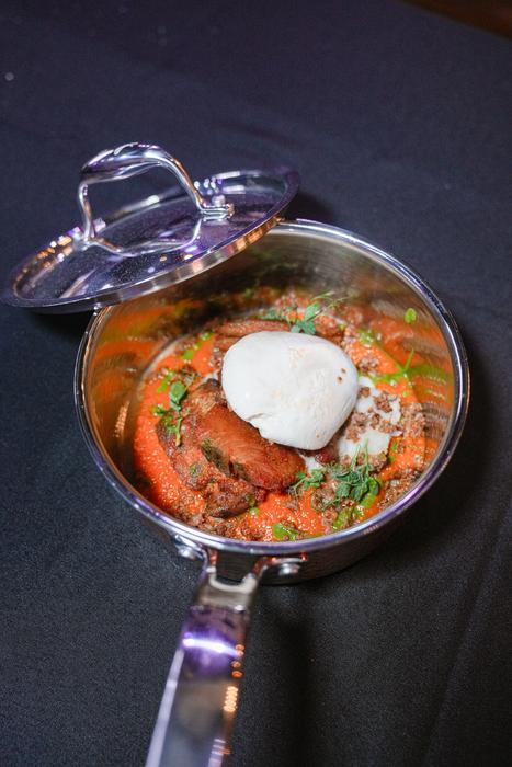 Crumbled Sausage and Roasted Red Pepper Sauce topped with Burrata